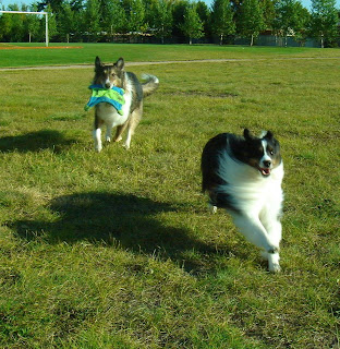 Just out back of our house and down the back alley a short distance, are the sports fields of a nearby high school. This is a great place to take the boys running, as it is quite large and if you situate yourself right, there is a good long distance before you hit any roads. I know, not "technically" an off leash park, but I'm sure to be respectful of others that use the park. We only go when it is empty and if anyone else shows up, the boys have a great recall and I bring them straight back to me to leash up.